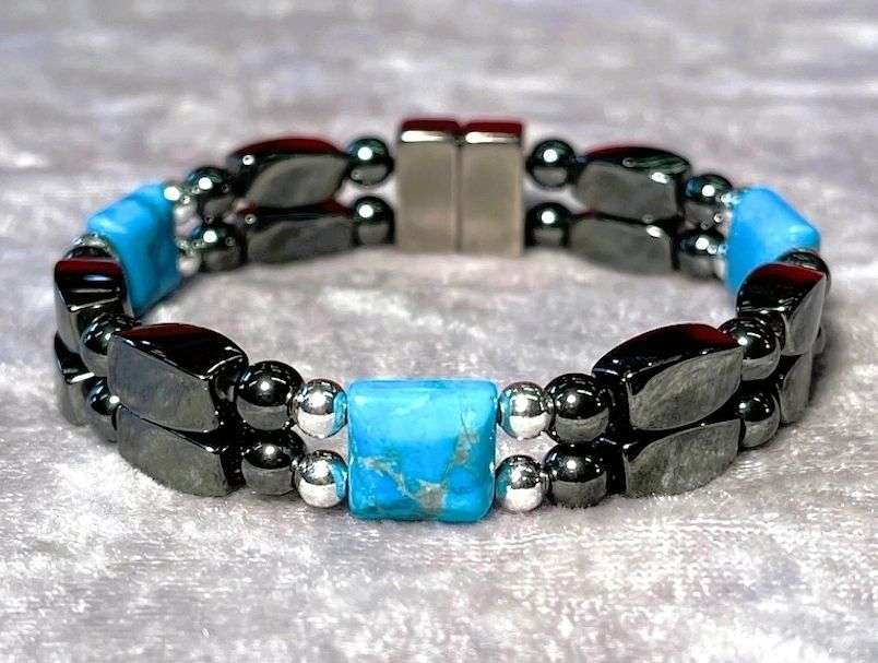 High power magnetic double-row bracelet w/semi precious blue turquoise bead. Turquoise, the captivating sea-green stone of the ancients, represents wisdom, tranquility, protection, good fortune, and hope.