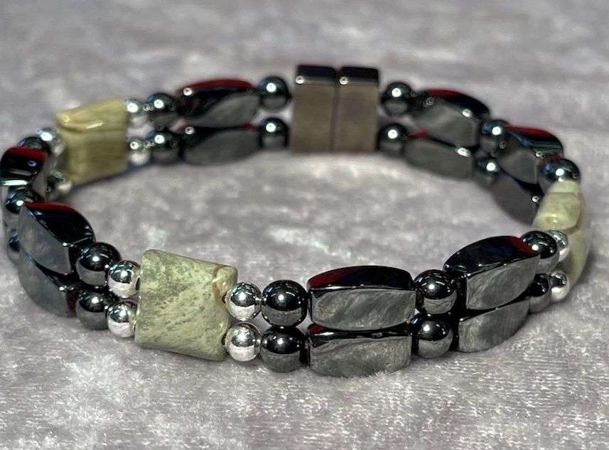 High power magnetic double-row bracelet. Semi-precious bead silver leaf jasper instills a feeling of wholeness, serenity, and being cared for.