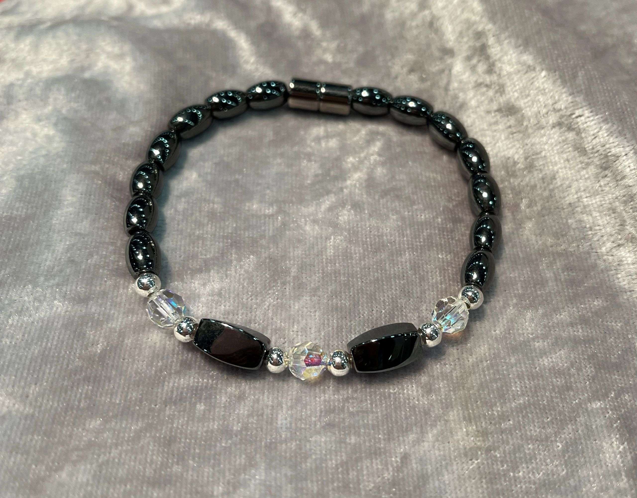 High power magnetic Bracelet with Swarovski Crystal. Swarovski crystals indicate a collaboration with all things we perceive. They bring positive energy, hope, joy, good luck, and diffuse negative energy. Made with 5X8 rice, 5X11 twist, 6mm Swarovski crystal round and silver accent beads.