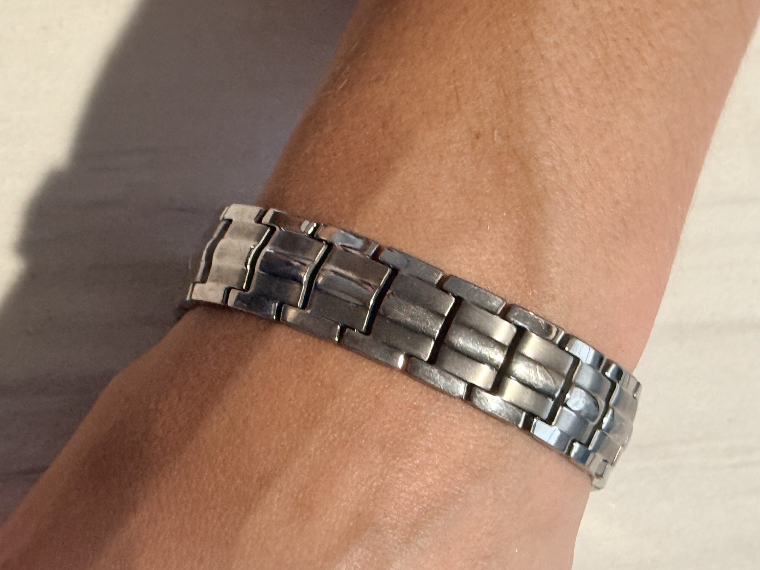 Sleek titanium bracelet with discreet magnets embedded inside for pain relief. A modern accessory blending style and wellness!  For extra power, there are 2 rows of magnets.  Comes with sizing tool